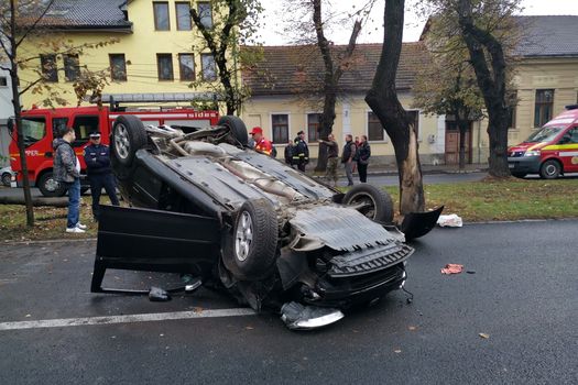 Un accident spectaculos a avut loc, duminică, pe un bulevard din muncipiul Bistriţa. În urma impactului dintre două maşini, una a fost proiectată într-un copac, pe care l-a rupt, iar autoturismul s-a răsturnat. În cele două maşini se aflau trei persoane, care au reuşit să iasă singure din autoturisme înainte de sosirea pompierilor.