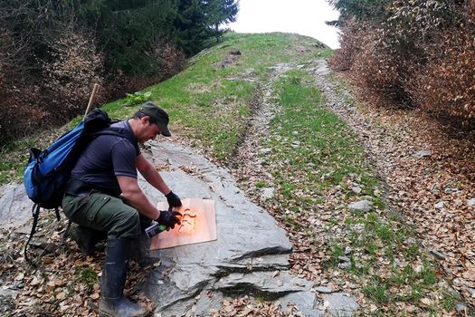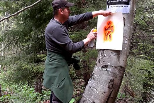 Traseul spre Poiana cu narcise este marcat cu ajutorul unor desene făcute pe copaci şi pietre. În desene apare omuleţul portocaliu care contrastează cu verdele pădurii.