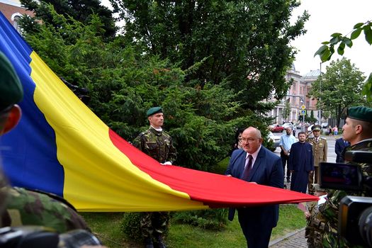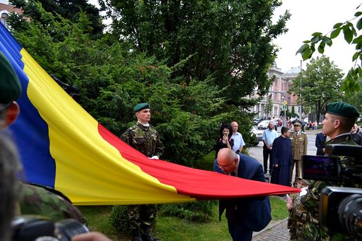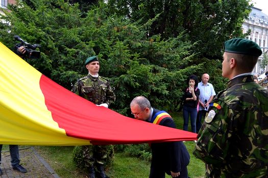 Tricolorul a fost depus, duminică seară, în cadrul unei ceremonii în Catedrala Mitropolitană din Cluj-Napoca şi sfinţit, după care, luni, de Ziua Drapelului Naţional, a fost scos din lăcaşul de cult de o gardă militară şi înălţat pe catarg în Piaţa Avram Iancu.