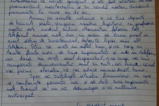 „Acum, cu această nebunie ce ne ţine departe de băncile şcolii, singura noastră legătură cu profesorii noştri este este mediul online. Momentan folosim toţi telefonul mamei mele, dar nu reuşim să ţinem pasul cu acest sistem de învăţământ, din cauza lipsei unui alt telefon. Ştiu că aveţi un suflet bun şi vă rog cu toată fiinţa mea să îmi împrumutaţi şi mie un telefon, iar dacă nu aveţi unul disponilbil, v-aş ruga să îmi cumpăraţi dumneavoastră unul în rate, iar lunar, când voi primi alocaţia vă voi aduce banii. Sper să înţelegeţi situaţia financiară cu care se confruntă părinţii mei şi să daţi curs rugăminţii mele. Promit să nu vă dezamăgesc!”, i-a scris eleva.