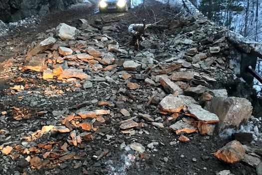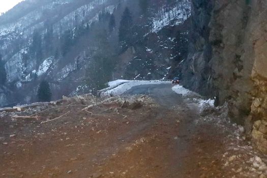 Pe aproximativ 100 de metri, drumul este plin de pământ şi pietre.