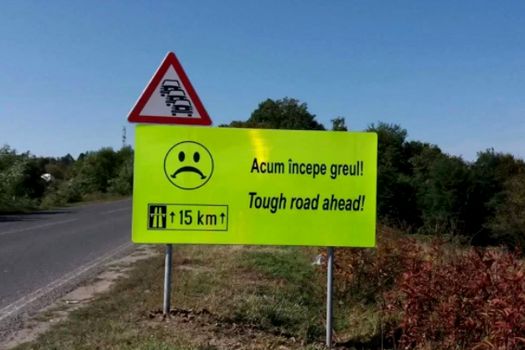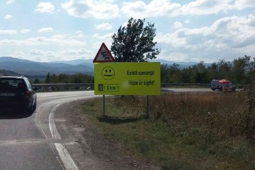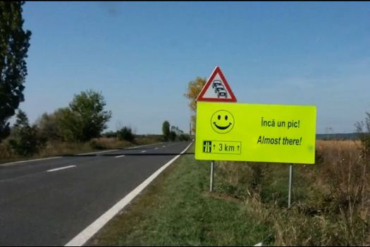 Astfel, şoferii pot observa din trei în trei kilometri panouri cu mesaje precum „Acum începe greul”, „Rezistă”, „Există speranţă” şi „Încă un pic”.