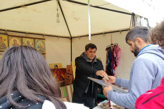 „Am adus icoane pe pânză, făcute la noi la mănăstire la Adămeşti, la Teleroman .Lumea nu înţelege conceptul ăsta de icoane pe pânză. Lumea caută litografiate, hârtii, cartoane. Astea sunt făcute cu o tehnică specială, în mănăstire, cu elemente de pictură manuală. Vânzarea merge slăbuţ. Lumea nu întelege că o icoană de asta e uşor de întreţinut, poate fi ştearsă cu o cârpă umedă, nu îşi pierde culorile. Deja am coborât preţurile la costurile de producţie. Nu ne mai trebuie să venim. O icoană când am ajuns era 25, acum o dau şi cu 15, am ajuns să vindem la jumătate de preţ. Nu mai venim la anul”, a declarat Dorin, unul dintre comercianţi.
