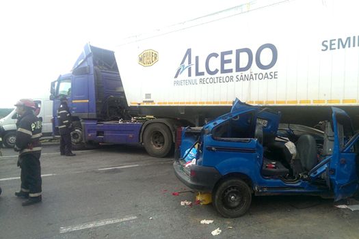 Potrivit purtătorului de cuvânt al Inspectoratului pentru Situaţii de Urgenţă (ISU) Bucureşti-Ilfov, accidentul s-a produs la ieşirea din localitatea ilfoveană Afumaţi spre Şindriliţa, după ce un autoturism Renault Kangoo a intrat într-un camion încărcat cu cereale care ieşea dintr-o curte fără să se asigure.