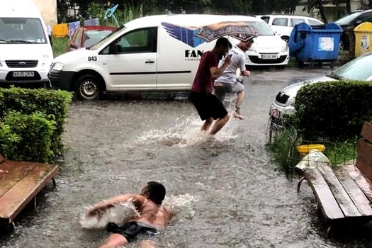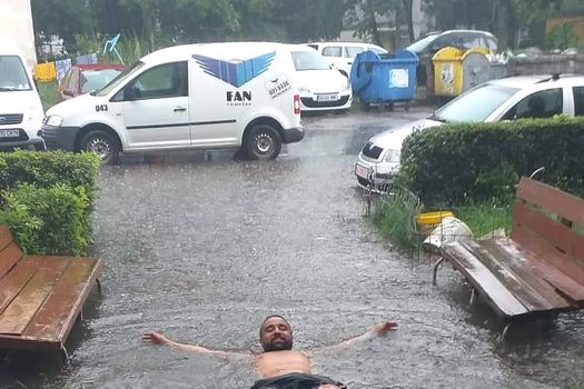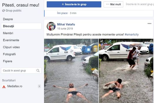 Un bărbat a fost pozat în timp ce înota pe o stradă inundată din Piteşti. Mai multe imagini, ce îl prezintă pe acesta fie înotând, fie făcând pluta în apa ce urcă până la gambă au fost postate de Mihai Vătafu, un utilizator Facebook, în grupul „Piteşti, oraşul meu”.
