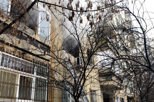„Arde cu flacără puternică şi degajare mare de fum pe casa scării”, anunţă pompierii.