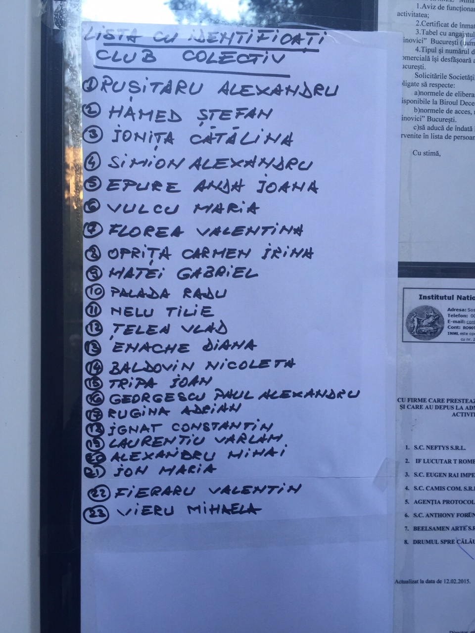 INML a afişat, la intrarea în institut, lista cu cele 23 de persoane decedate care au fost identificate, listă pe care o prezentăm integral: Ruşitaru Alexandru, Hamed Ştefan, Ioniţă Cătălina, Simion Alexandru, Epure Anda Ioana, Vulcu Maria, Florea Valentina, Opriţă Carmen Irina, Matei Gabriel, Palada Radu, Nelu Tilie, Ţelea Vlad, Enache Diana, Baldovin Nicoleta, Tripa Ioan, Georgescu Paul Alexandru, Rugină Adrian, Ignat Constantin, Laurenţiu Varlam, Alexandru Mihai, Ion Maria, Fieraru Valentin şi Vieru Mihaela.