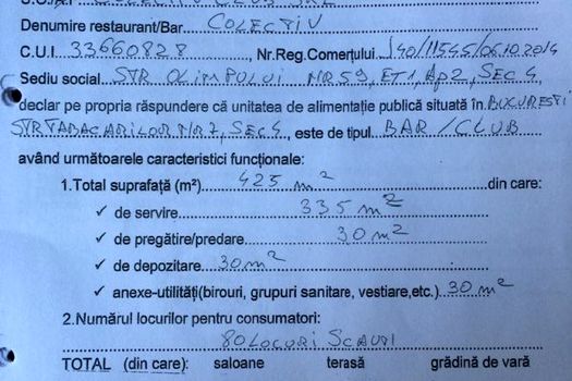 Ulterior emiterii acestuia, S.C. Colectiv Club SRL s-a adresat Primăriei Sectorului 4, solicitând eliberarea acordului şi autorizaţiei de funcţionare. Primăria arată că, în acest sens, a depus un dosar conţinând: certificatul de înregistrare de la Registrul Comerţului, actul constitutiv de înfiinţare a societăţii, certificatul constatator pentru punctul de lucru, dovada spaţiului, contractul de salubrizare, certificat fiscal emis de Direcţia Generală de Impozite şi Taxe Locale Sector 4, chitanţa dovedind achitarea taxei aferentă eliberării.