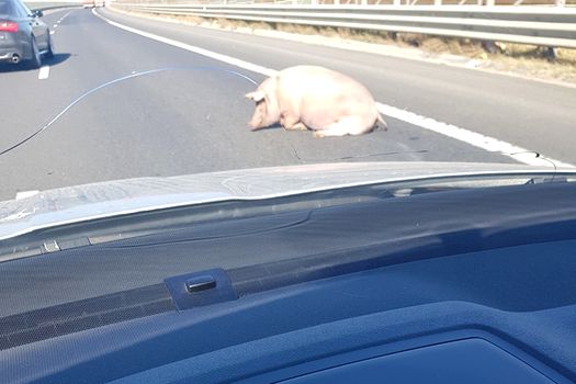 „Atenţie pe autostradă pe direcţia Nădlac înainte de ieşirea de la Mediaş. Un porc viu care nu se poate mişca”, a scris persoana care a făcut poza.
