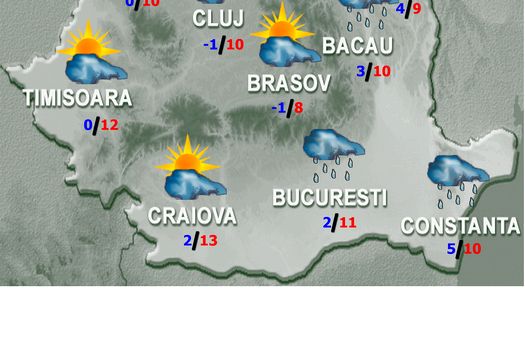 Va ploua slab pe spaţii mici în sudul, estul şi centrul ţării, iar în zona montană înaltă vor fi precipitaţii trecătoare mai ales sub formă de ninsoare. Vântul va sufla slab până la moderat, cu intensificări locale, îndeosebi ziua, în Moldova, Bărăgan, Dobrogea şi sud-vestul Olteniei. Temperaturile maxime se vor încadra între 6 şi 14 grade, iar cele minime între -2 şi 5 grade, uşor mai scăzute în depresiuni. Ceaţa se va semnala izolat în primele ore în extremitatea de vest, iar noaptea se poate forma pe arii restrânse în zonele joase din toată ţara. .