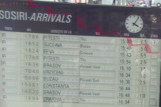 Astfel, potrivit site-ului www.cfr.ro, care updatează imagini live cu panoul de Plecări – Sosiri din centrul Gării de Nord, cea mai mare întârziere la ora 16.00 este cea de 65 de minute, a trenului IR 1786, care ar fi trebuit să sosească de la Piteşti la ora 15.00.