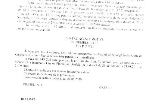 Totodată, instanţa arată că are convingerea că lăsarea în libertate a asistentei Cîrstea „prezintă un pericol concret pentru ordinea publică, iar măsura privării de libertate este adecvată pentru asigurarea bunei desfăşurări a procesului penal”.