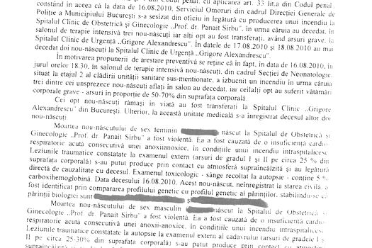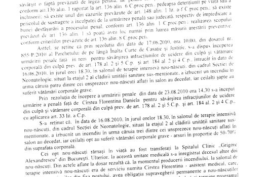 „Infracţiunile pentru care inculpata este cercetată, în prezenta cauză, sunt infracţiuni săfârşite din culpă printr-un concurs de împrejurări. Contribuţia inculpatei, indiferent de cauzele incendiului, fiind una majoră, întrucât aceasta, prin nerespectarea îndatoririlor de serviciu, nu a depistat declanşarea incendiului şi nu a asigura posibilitatea salvării celor 11 bebeluşi de la deces, respectiv de la vătămarea corporală gravă”, potrivit motivării, obţinută de MEDIAFAX.