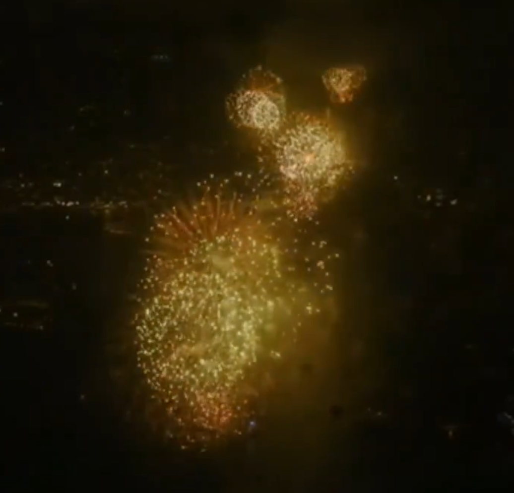 Vârful turnului a fost iluminat în diferite culori, în timp ce artificiile explodau pe cer.