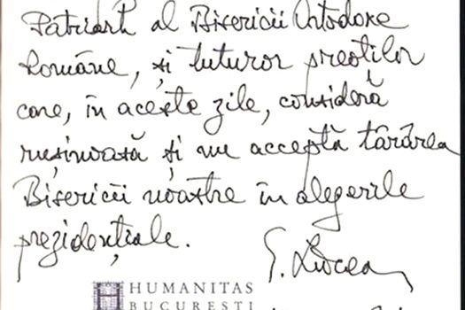Pe această pagină de Facebook a fost postată şi o imagine cu dedicaţia-autograf pe care Gabriel Liiceanu i-a trimis-o Patriarhului Daniel: „Preafericitului Părinte Daniel, Patriarh al Bisericii Ortodoxe Române, şi tuturor preoţilor care, în aceste zile, consideră ruşinoasă şi nu acceptă târârea Bisericii noastre în alegerile prezidenţiale”.