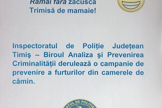 „În cămin sau în chirie, oriunde alegeţi să vă mutaţi, nu lăsaţi bagajele nesupravegheate pe holuri, alei, ori în faţa căminului. Nu lăsaţi geamurile, portierele şi portbagajul autoturismului deschise, chiar dacă îl părăsiţi pentru scurt timp şi aveţi bunuri la vedere în interiorul maşinilor (borsete, laptop, acte, genţi etc.). Pentru ca drumul cu trenul spre localitatea în care alegeţi să urmaţi studiile să fie lipsit de probleme, aveţi grijă de bagaje şi în relaţiile cu necunoscuţii! Nu înstrăinaţi cheia camerei, dând posibilitatea unor persoane rău intenţionate să confecţioneze o copie după aceasta”, atrag atenţia poliţiştii.