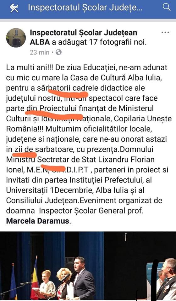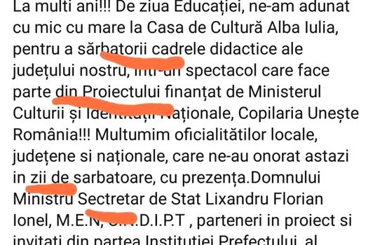 ”La multi ani!!! De ziua Educaţiei, ne-am adunat cu mic cu mare la Casa de Cultură Alba Iulia, pentru a sărbatori cadrele didactice ale judeţului nostru, intr-un spectacol care face parte din Proiectul finanţat de Ministerul Culturii şi Identităţii Naţionale, Copilaria Uneşte România!!! Multumim oficialitătilor locale, judeţene si naţionale, care ne-au onorat astazi in zi de sarbatoare, cu prezenţa,domnului Ministru Secretar de Stat Lixandru Florian Ionel, M.E.N, C.N.D.I.P.T , parteneri in proiect si invitati din partea Instituţiei Prefectului, a Universitaţii 1 Decembrie 1918 Alba Iulia şi a Consiliului Judeţean.Eveniment organizat de doamna Inspector Şcolar General prof. Marcela Daramus”, se arată în mesajul corectat, parţial, după criticile internauţilor.