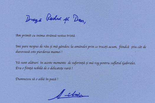 „Dragă Radu şi Dan, Am primit cu inima strânsă vestea tristă. Îmi pare nespus de rău şi mă gândesc la amândoi prin ce treceţi acum, fiindcă ştiu cât de dureroasă este pierderea mamei! Vă sunt alături în aceste momente de suferinţă şi mă rog pentru sufletul Gabrielei. Era o fiinţă nobilă de o delicateţe rară! Dumnezeu să o aibă în pază! Mihai”, se arată în scrisoarea semnată de Regele Mihai, postată pe site-ul Casei Regale.