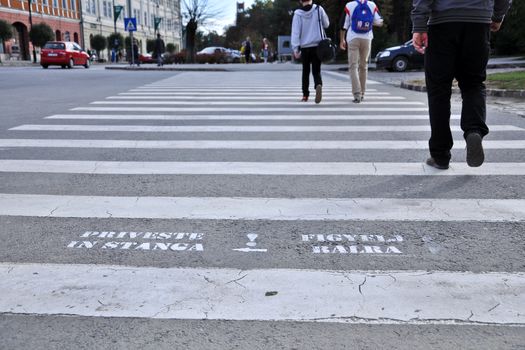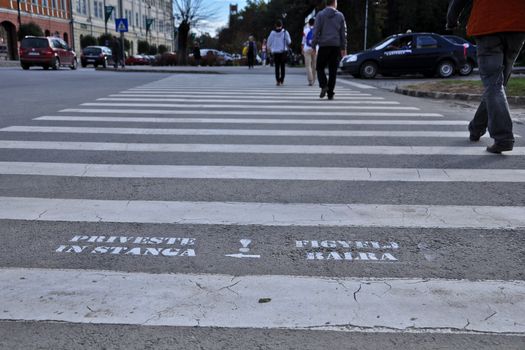 Mesajele de avertizare – „Priveşte în dreapta” şi „Priveşte în stânga” – au fost scrise pe asfalt, de fiecare parte a trecerilor de pietoni, în limbile română şi maghiară.
