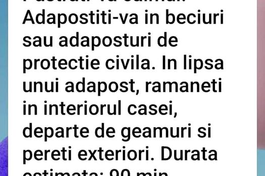 „Ro-Alert: alertă extremă. Există posibilitatea căderii unor obiecte din spaţiul aerian. Păstraţi-vă calmul. Adăpostiţi-vă în beciuri sau adăposturi de protecţie civilă. În lipsa unui adăpost, rămâneţi în interiorul casei, departe de geamuri şi pereţi exteriori. Durata estimată: 90 minute”, scrie în mesajul primit de români după miezul nopţii.