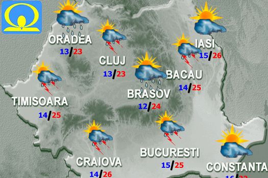 Cerul va fi variabil, cu unele înnorări şi trecător averse şi descărcări electrice, mai ales după-amiaza şi în prima parte a nopţii. Vântul va sufla slab şi moderat. Temperatura maximă va fi de 24…25 de grade, iar cea minimă de 14…15 grade.