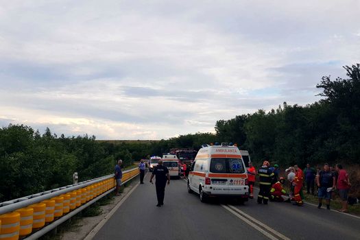 UPDATE: Potrivit ISU Giurgiu, în total, 17 persoane au fost implicate în accident, 13 din microbuz şi 4 din autoturism.