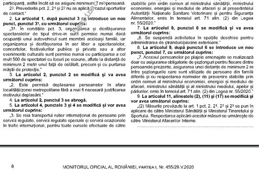 - Se redeschid terasele în aer liber, cu respectarea unor condiţii: o distanţă de minimum 2 m între mese şi cel mult patru persoane la o masă, dacă sunt din familii diferite. Regulile suplimentare ce vor trebui respectate de proprietari nu au fost încă publicate de Ministerul Economiei.