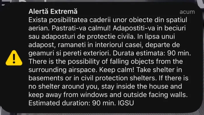 „Decizia transmiterii mesajului RO-ALERT a fost luată în urma unei informări primite de la Statul Major al Forțelor Aeriene, care, prin mijloacele proprii de supraveghere, a detectat existența unor ținte aflate în deplasare către zona de frontieră dintre România și Ucraina”, arată ISU Tulcea.