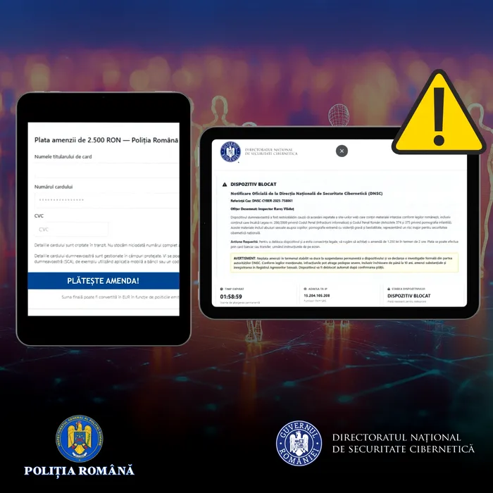 Autoritățile române nu blochează dispozitive prin astfel de mesaje. Nu solicită plata amenzilor prin pagini web, pop-up-uri sau sub presiunea timpului. Orice astfel de notificare trebuie ignorată și raportată.