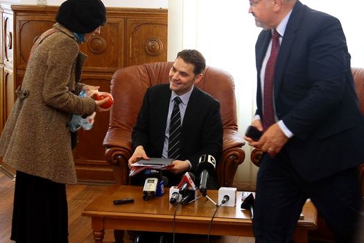 Ministrul s-a ridicat de pe fotoliu, s-a scuturat pe mânecile sacoului, continuând să zâmbească, în timp ce prefectul de Cluj, Ioan Gheorghe Vuşcan, a luat repede tableta şi documentele pentru a le curăţa.