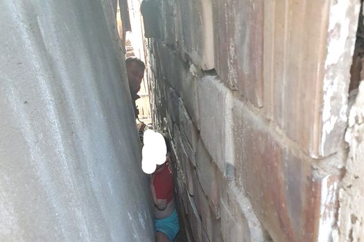 Aceasta a intrat între cei doi pereţi ai clădirii să se joace, dar a rămas blocată.