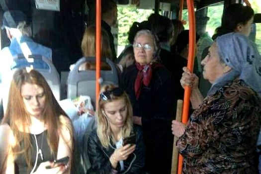 Imaginea surprinde câteva tinere care ocupă locurile dintr-un autobuz de transport în comun, în timp ce două femei bătrâne călătoresc în picioare.