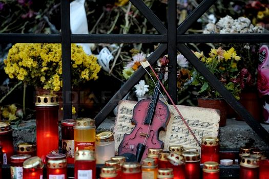 Un steag tricolor, o vioară, jucării de pluş se numără printre obiectele expuse alături de flori şi lumânări, la clubul Colectiv.