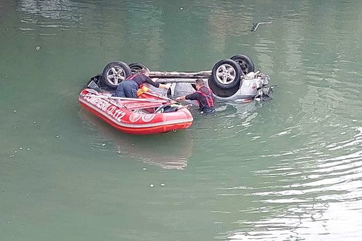 Maşina este scufundată parţial, iar apa e adâncă de aproximativ un metru.