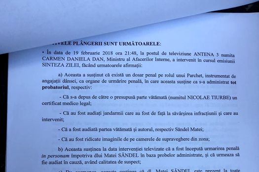„Aceasta a susţinut că există un dosar penal pe rolul unui Parchet, instrumentat de angajaţii dânsei, ca organe de urmărire penală, în care aceasta susţine că s-a administrat tot probatoriul. Aceasta susţinea la momentul intervenţiei televizate că a început urmărirea penală împotriva subsemnatului şi că urmează să fiu audiat. De asemenea susţine că subsemnatul sunt prezent la toate manifestările publice împotriva Guvernului din ultimul an şi că aş avea şi foarte multe amenzi contravenţionale. De asemenea a susţinut că poliţiştii aflaţi în subordinea acesteia şi-au făcut treaba. Menţionez că la data intervenţiei televizate nu aveam cunoştinţă de existenţa niciunui dosar penal, nu fusesem audiat niciodată şi nu mi-a fost adusă de îndată la cunoştinţă calitatea de suspect aşa cum prevăd normele procesuale. menţionez că a doua zi, dimineaţă, am fost căutat la domiciliu de un ofiţer de poliţie care mi-a comunicat că există un dosar penal în care am calitatea de suspect”, se arată în plângerea penală depusă de Sandi Matei la DNA.