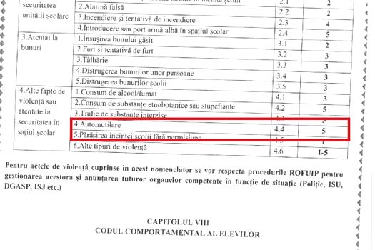 Regulamentul unei şcoli din judeţul Constanţa prevede ca elevilor să le fie scăzute 5 puncte din nota la purtare dacă se automutilează. Asociaţia Elevilor din Constanţa a semnalat cazul şi cere modificarea de urgenţă a regulamentului.