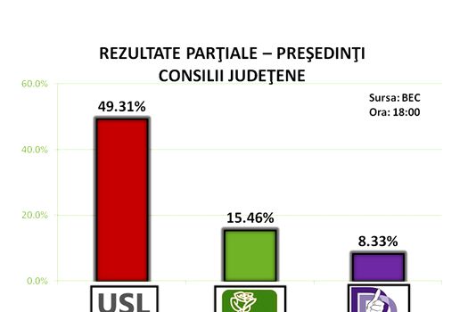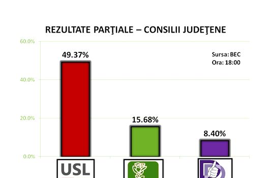 USL a câştigat 49,68% din voturile valabil exprimate pentru consiliile judeţene, PDL – 15,24%, iar PPDD – 8,95%, după centralizarea rezultatelor din 16.190 din cele 16.910 secţii de votare din ţară, potrivit rezultatelor parţiale făcute publice, marţi, de BEC.