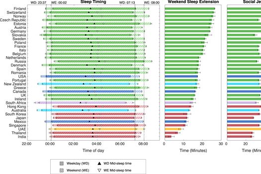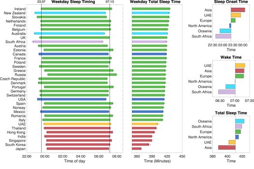 Cercetătorii au constatat că modelele de somn variază considerabil de la o ţară la alta. Aşa cum era de aşteptat, cei mai slab calitativ somn se găseşte în ţările asiatice, unde, într-o seară obişnuită din timpul săptămânii, oamenii dorm mai puţin de şase ore şi jumătate – cu aproximativ 30 de minute mai puţin decât cei din restul lumii. Cei care dorm cel mai bine sunt în principal în ţările din nordul Europei (Estonia, Finlanda, Irlanda şi Ţările de Jos), precum şi în Australia şi Noua Zeelandă, unde utilizatorii înregistrează în medie şapte ore de somn.