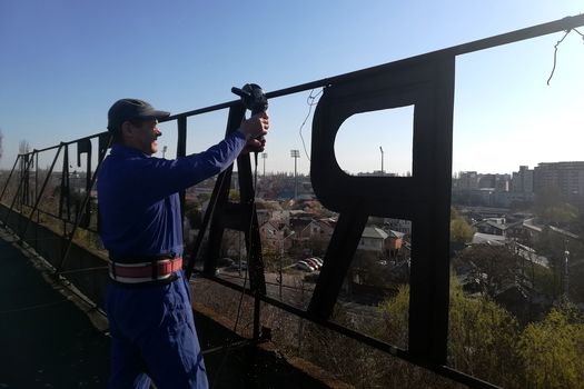 , scris cu litere de metal, fusese montat în 1965, odată cu terminarea blocului A12. În 55 de ani doar litera P a căzut, la o furtună. În această dimineaţă, Dumitru Marian şi Neculai Pleşa, membri ai Comunităţii Curăţăm Galaţiul, cu permisiunea administraţiei blocului şi cu ajutorul locatarilor, au îndepărtat mesajul comunist de pe faţada imobilului. Facem apel la gălăţeni ca, în cazul în care au cunoştinţă despre alte mesaje sau simboluri similare, să ni le semnaleze, pentru a le îndepărta. Înţelegem că autorităţile sunt prea ocupate cu întreţinerea bordurilor, aşa că suntem noi dispuşi să dăm o mână de ajutor”, au anunţat reprezentanţii Asociaţiei „Curăţăm Galaţiul”.