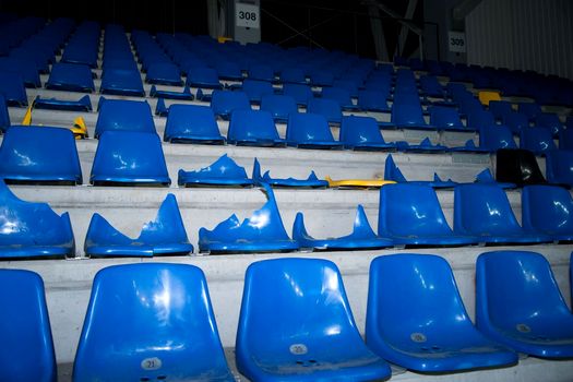 Astfel, au fost distruse 241 de scaune din peluzele destinate galeriei oaspeţilor, iar alte 40 de scaune lipsesc din această peluză.