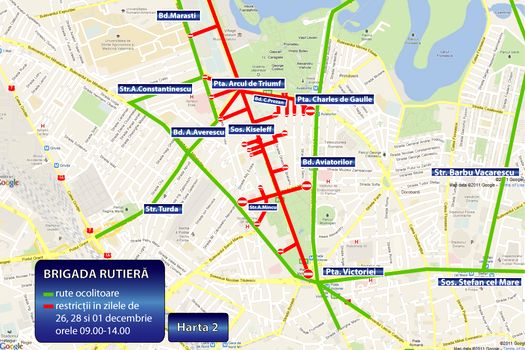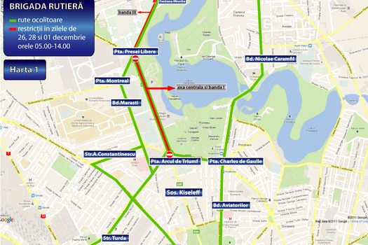 Între orele 5.00 – 14.00, traficul va fi restricţionat pe axul central al Şoselei Kiseleff şi banda I de circulaţie, pe tronsonul cuprins între Piaţa Presei Libere şi Piaţa Arcul de Triumf, iar între orele 9.00 – 14.00, va fi închisă total circulaţia pe Şos. Kiseleff, între Piaţa Presei Libere şi Piaţa Victoriei, pe Str. Alexandru Constantinescu, între Piaţa Arcul de Triumf şi Bd. Mărăşti, pe Bd. Mareşal Alexandru Averescu, între Piaţa Arcul de Triumf şi Bd. Mărăşti şi pe Bd. Constantin Prezan, între Piaţa Arcul de Triumf şi Piaţa Charles de Gaulle.