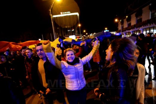 Manifestanţii au lansat artificii, au cântat imnul naţional şi au fluturat steaguri tricolore, au scandat numele lui Klaus Iohannis şi au strigat „Victorie”.