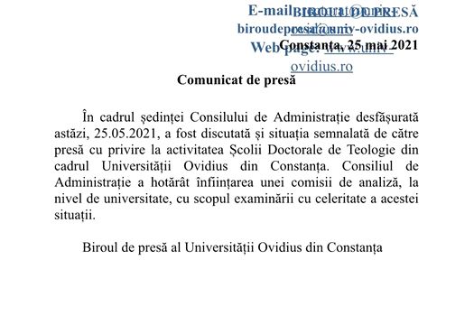 „În cadrul şedinţei Consilului de Administraţie desfăşurată astăzi, 25.05.2021, a fost discutată şi situaţia semnalată de către presă cu privire la activitatea Şcolii Doctorale de Teologie din cadrul Universităţii Ovidius din Constanţa. Consiliul de Administraţie a hotărât înfiinţarea unei comisii de analiză, la nivel de universitate, cu scopul examinării cu celeritate a acestei situaţii”, transmite biroul de presă al Universităţii Ovidius din Constanţa.