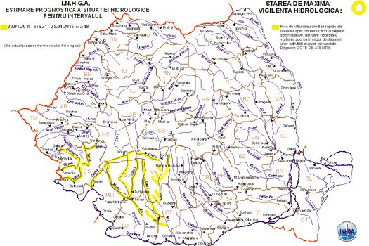 Astfel, a fost instituit codul galben de inundaţii pe râurile din bazinele hidrografice Timiş superior, Bârzava, Caraş, Nera, Cerna (judeţele Caraş-Severin şi Timiş), Jiu superior şi mijlociu (judeţele Mehedinţi, Gorj, Hunedoara şi Dolj) şi pe unii afluenţi ai Oltului din judeţele Vâlcea, Dolj, Gorj, Olt şi Argeş.