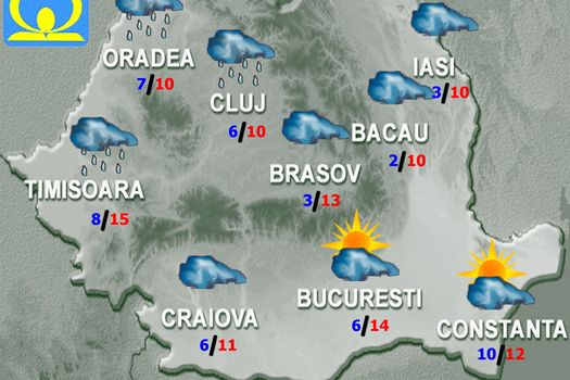 Valorile de temperatură vor continua să crească, astfel încât vremea va deveni normală termic în majoritatea regiunilor. Cerul va fi mai mult noros în vestul, centrul şi nordul ţării, unde va ploua mai ales în prima parte a zilei şi spre sfârşitul nopţii. În restul teritoriului înnorările vor fi temporare, iar ploile în general slabe se vor semnala pe arii mai restrânse. Vântul va avea unele intensificări la munte, în zona montană înaltă rafalele depăşind 70 km/h, dar temporar şi în Banat, Moldova şi Dobrogea, cu viteze de peste 50 km/h. Temperaturile maxime vor fi cuprinse între 4 grade în extremitatea nordică a Moldovei şi 17 grade în Muntenia, iar cele minime, în general, între 0 şi 9 grade.