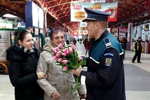 Şi poliţiştii de la Transporturi au oferit flori doamnelor şi domnişoarelor pe care le-au întâlnit pe peronul Gării de Nord din Bucureşti.