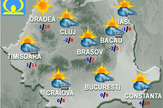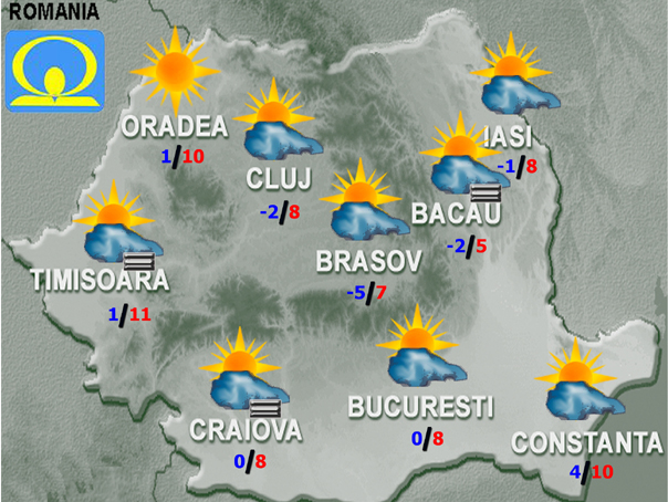 Vremea se va menţine uşor mai rece decât în mod obişnuit la această dată. Cerul va fi variabil, iar vântul va sufla slab până la moderat. Temperaturile maxime vor fi cuprinse între 5 şi 13 grade, iar cele minime între -4 şi 5 grade, mai coborâte în estul Transilvaniei, spre -9 grade. În zonele joase dimineaţa şi noaptea va fi ceaţă, posibil persistentă pe arii restrânse la câmpie.