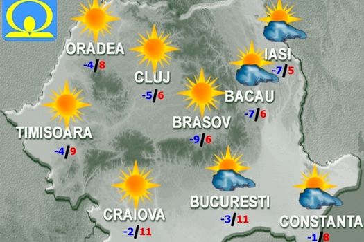 Temperaturile maxime, în scădere în regiunile extracarpatice, dar în creştere în vest, vor fi cuprinse între 2 şi 12 grade. Temperaturile minime se vor situa de la -13 / -12 grade în estul Transilvaniei până la 4…5 grade în sudul Banatului. Dimineaţa şi noaptea, în zonele joase vor fi condiţii de ceaţă.