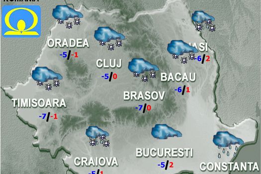 Temperaturile maxime vor avea valori de la -3 grade în nordul Moldovei până la 11 grade în sudul Banatului, iar cele minime se vor încadra între -6 şi 4 grade, mai ridicate în Dealurile de Vest.