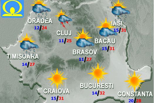 Vor fi averse şi, trecător, descărcări electrice în Maramureş, pe arii restrânse în Crişana, Transilvania şi jumătatea de nord a Moldovei şi izolat în Banat. Vântul va sufla moderat, cu unele intensificări la munte. Temperaturile maxime se vor încadra de la 19…20 de grade în nord-vest până la 33 de grade în sudul extrem. Minimele temice vor fi cuprinse, în general, între 8 şi 18 grade. Noaptea, în zonele joase, izolat se va semnala ceaţă.